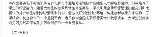 【广东省教育厅】岭南职院获全国大学生企业经营管理沙盘大赛省赛一等奖作者:王颖 信息来源:广东省教育厅 点击数: 更新时间:2012-5-30 http://www.gdhed.edu.cn/main/view.php?tid=330194&cid=124 由教育部高职高专工商管理类专业教学指导委员会举办的“全国大学生企业经营管理沙盘模拟大赛”广东省赛于5月26日至27日在深圳职业技术学院盛大举行。来自广东省的41支参赛队伍,180多名选手进行了激烈的角逐。 广东岭南职业技术学院商学院会计电算化专业,在商学院领导的大力支持下,经过两轮的校内严格资格赛选拔后,由商学院王颖、郎东梅作为带队指导老师,选出四位同学组成一支代表队参赛。第一天的省赛预赛以小组形式进行,每小组取前6名进入决赛,经过角逐,商学院学子以小组第一的成绩进入决赛,并喜获“2012年全国大学生企业经营管理沙盘大赛省赛一等奖”。第二天的决赛分两个赛区进行,获省赛决赛前四名的队伍将最终入围全国比赛,而商学院学子不负众望,以省赛决赛第二名的成绩顺利入围。 据介绍,全国大学生企业经营管理沙盘大赛是我国高等职业教育经管类专业迄今规模最大的重大比赛活动,每年举办一届,今年已经成功举办四届,将有600多所高校参加比赛。 本次比赛实现了岭南职院会计电算化专业培养高端技术技能型人才的培养目标,引导培养了学生的经营能力;随着大学生的创业热情越来越高涨,学校利用企业经营管理沙盘实训和比赛作为提升学生创新创业素质和能力、营造良好创新创业环境、构建创新创业人才培养、工学结合、校企合作的一个重要平台,也已作为全国高职经管类专业教学改革、大学生创新实训实习实践教学成果交流和展示的一个重要载体。 (文/王颖) |