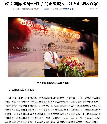 【腾讯网】岭南国际服务外包学院正式成立 为华南地区首家作者:刘冬梅 信息来源:腾讯网 点击数: 更新时间:2012-6-11 http://edu.qq.com/a/20120608/000587_1.htm