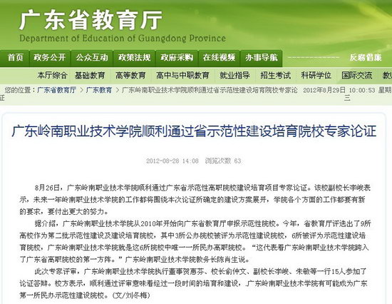 据介绍,广东岭南职业技术学院从2010年开始向广东省教育厅申报示范性院校。今年,省教育厅评选出了9所高校作为第二批示范性建设及建设培育院校,其中3所公办院校被评为示范性建设院校,6所被评为示范性建设培育院校,广东岭南职业技术学院就是这6所院校中唯一一所民办高职院校。“这代表着广东岭南职业技术学院跨入了广东省高职院校的第一方阵。”广东岭南职业技术学院教务长陈肖生说。