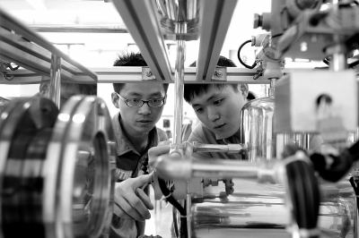 2013年全国大学生“西门子杯”工业自动化挑战赛总决赛日前在上海应用技术学院举行。为吸纳更多优秀的高职高专学生参赛,今年在设计开发型竞赛组新增了高职组组别。图为上海应用技术学院的学生们在调试自动化设备。 新华社记者 刘颖 摄