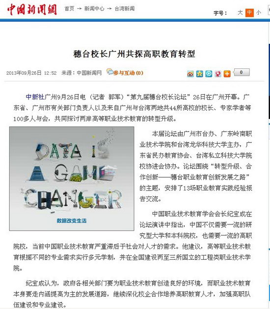 中新社讯 广州9月26日电 (记者 郭军)“第九届穗台校长论坛”26日在广州开幕。广东省、广州市有关部门负责人以及来自广州与台湾两地共44所高校的校长、专家学者等100多人与会,共同探讨两岸高等职业技术教育的转型升级。