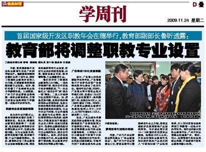 日前,首届国家级开发区职业教育年会在广州科学城召开。国家教育部副部长鲁昕出席了该年会,剖析了我国职业教育存在的几大问题,并透露教育部将调整职教专业设置。此外,鲁昕考察了广东岭南职业技术学院等职校。记者获悉,广州市开发区萝岗区将构建一流职业教育基地,并将引进新加坡南洋理工学院等一批高水平办学项目。
