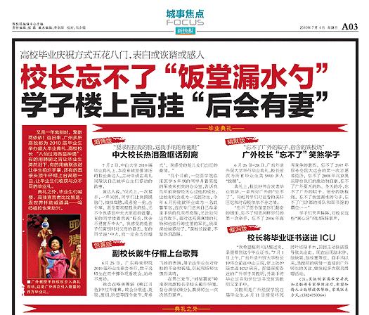 ■专题采写:新快报记者 陈红艳 实习生 于杨 王琪 通讯员甘应鑫 又是一年离别时,聚散两依依!连日来,广州多所高校都为2010届毕业生举办盛大毕业典礼,高校校长“八仙过海各显神通”,有的用肺腑之言让毕业生潸然泪下,有的用幽默诙谐让学生拍烂手掌,还有的直接头顶牛仔帽上台高歌一曲,让毕业生们收获与众不同的毕业礼。 典礼之外,毕业生们喊楼、高挂宣言者比比皆是,连世界杯助威道具——呜呜祖拉也来助兴。 ——毕业典礼—— 煽情版 中大校长热泪盈眶话别离 “要求捏捏我的脸,送我手纳的布拖鞋” 7月2日,中山大学2010届毕业典礼上,本没有被安排讲话的校长黄达人,主动申请在典礼间隙谈自己被毕业生们感动的故事。 黄达人说,“仪式上,一次握手,一声问候,同学们让我摸摸脑门,拍拍肩膀,或者抱一抱、击个掌,甚至要求捏捏我的脸,无不令我感到中大大家庭的温馨。有的同学搂着我说‘校长,我舍不得离开中大’,我感受的是孩子们离别时对父母的眷恋。有的同学说‘中大,我一定会为你增光’,我感受的是儿女们出征的豪情。” “几个月前,一位医学院临床医学5年制的同学身着笔挺的军装来到我的办公室,告诉我几年前我曾经关心过他的成长,让他有机会成为一名国防生。今年6月份他就毕业成为一名武警军官,这次专门送来自己母亲亲手纳的几双布拖鞋,无论如何让我收下。面对这充满真情的礼物和他临行时庄重的军礼,我深深地被感动了。”黄校长说着,不禁热泪盈眶。 惊喜版 副校长戴牛仔帽上台歌舞 6月25日,广东岭南职院2010届毕业生晚会举行,数千名师生在雨中撑伞观看晚会,始终不离场。 晚会在唯美舞蹈《峡江月色》中拉开帷幕。晚会分痕迹、斑驳、离别、盼望等四个章节,青春飞扬的表演,展示出毕业生对母校的不舍和祝福,引起现场师生强烈共鸣。 在第三章节,“神秘嘉宾”岭南职院副校长李峻头戴牛仔帽,登台演唱《缘分》,赢得师生一次次热烈掌声。 幽默版 广外校长“忘不了”笑煞学子 “忘不了广外的蚊子、宿舍的铁板烧” 6月26日-28日,广东外语外贸大学举行毕业典礼,校长首次为所有毕业生共5000多人“拨穗”。 典礼上,校长仲伟合发表毕业致辞,一系列对广外的“忘不了”,勾起同学们对往昔的美好回忆和对母校依依不舍之情。 “忘不了图书馆里你们勤奋的脚印,忘不了相思河畔你们的第一次牵手,忘不了2006年高考竞争的激烈,忘不了2007年服务全国大运会的第一次志愿者经历,忘不了2008年北京奥运带给我们的激动和自豪,忘不了广外夏天的热、冬天的冷,忘不了广外的蚊子、宿舍的铁板烧,忘不了饭堂漏水的勺子,忘不了门诊部的排队和图书馆的霸位……” 学子们笑声阵阵,对校长这些“真心话”报以阵阵掌声。 催泪版 …… 原报地址《新快报》2010年7月4日A3版 http://news.dayoo.com/guangzhou/201007/04/73437_13192047.htm