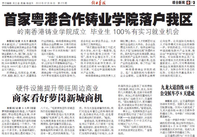 【创业导报】首家粤港合作铸业学院落户我区作者:佚名 信息来源:本站原创 点击数: 更新时间:2010-7-6