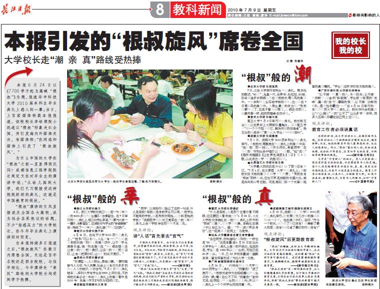 长江日报6月24日以《7700学子起立高喊“根叔”》为题,报道华中科技大学2010届本科生毕业典礼上感人的一幕;当日,上百家媒体转载本报报道。该校校长李培根院士迅速以“根叔”形象走红全国,并引发海内外媒体关注。有媒体称:“在网络和媒体上引发了‘根叔旋风’。” 为什么中国的大学在“根叔”之前一直显得很沉闷?成都信息工程学院院长周定文在对毕业生的演讲中说:“从幼儿园到大学,我们已习惯接受这种规规矩矩的典礼,这就是中国教育的现状。” “根叔”演讲的文风直接波及全国各大高校,成为社会各界热议的话题。不少“倍感压力”的大学校长,在今年毕业典礼上演讲因时而变。 自本报持续多日报道之后,“根叔旋风”在数日内席卷全国。无论是百年名校还是职业院校,与往年相比,今年演讲走“亲民”路线的大学校长均受到学子热捧。 …… “根叔”般的真 ●重庆大学校长李晓红 “什么是母校,就是那个左看右看不顺眼,但还要回来看的地方!”6月28日,重庆大学校长李晓红在该校毕业典礼上所作的“根叔”式演讲,受到学子热捧。李晓红在演讲中以自己为例,提出“干出成绩再谈身价”,这一经典寄语在网上广为流传。 ●汕头大学董事会名誉主席李嘉诚 “各位同学,你知道吗?我和你们一样也是‘80后’。”这是李嘉诚6月30日在汕头大学学生毕业典礼上演讲的开场白。他说的是,学生们是1980年以后出生的,而他已经80岁出头。当日,已82岁的李嘉诚用幽默诙谐又富含深意的话语与汕大学子交流。 ●岭南职院校长俞仲文 6月26日,广东岭南职业技术学院2010届学生毕业典礼之后,“找着没?”成了流行语。该校校长俞仲文在轻轻握起毕业生手的时候,嘴里总忘不了问:“找着没?”俞仲文说,他很担心毕业生的就业去向,所以毕业典礼上一个个问学生找没找着工作。 …… “根叔旋风”后更期教育家 “根叔”的稀缺,反衬出大学精神的缺失。大学校长作为社会灯塔的守夜人,也应对他们有更高的期待。我们需要“根叔”这样可亲可敬的校长,我们更需要既能仰望星空,又能脚踏实地,能够革故鼎新的真正教育家。——《新华每日电讯》 “根叔式演讲”是一种明显的进步,让人们隐隐看到大学的希望。但中国大学要回归教育本质,必须在去行政化改革上迈出实质步伐,否则“根叔式演讲”带来的希望可能只是昙花一现。——新加坡《联合早报》 长江日报记者朱建华 原报地址《长江日报》2010年7月9日第8版 http://cjmp.cnhan.com/cjrb/html/2010-07/09/content_3609052.htm