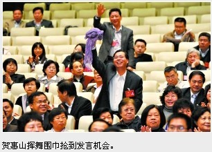 “本届是最后一次发言机会了,能否给我几分钟?”昨日上午,政协大会发言对于很多委员而言,也许将是政协委员生涯中的最后发言机会。为了不留下遗憾,在即席发言时“抢麦”竞争异常激烈,上演了一场议政盛宴:飞奔抢麦,连举十次手,一只手不够用举双手,道具围巾、报纸、口红一起上,眼看时间结束,急中生智,临时写申请书递上主席台,最终连主持人都被感动,破例延时。
