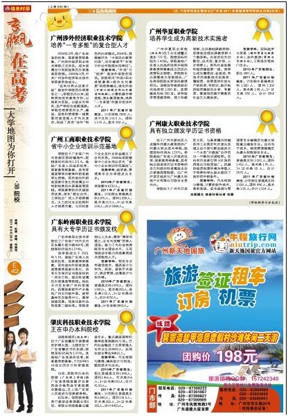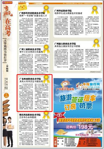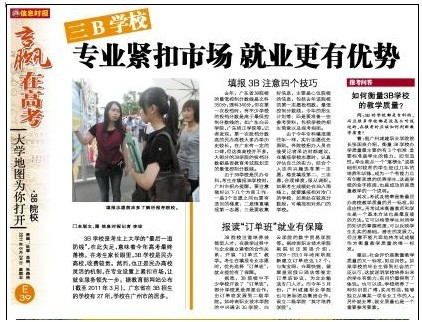 【信息时报】三B学校专业紧扣市场 就业更有优势作者:刘潇 信息来源:信息时报 点击数: 更新时间:2011-6-27 在6月24日的高考特刊中,信息时报对广州市的3B院校进行了报道,并重点报道了广东岭南职业技术学院的订单班及就业优势,同时对我校进行了推荐,特此转载。三B学校专业紧扣市场 就业更有优势 本版撰文信息时报记者刘潇3B学校是考生上大学的“最后一道防线”,在此失足,意味着今年高考最终落榜。在考生家长眼里,3B学校是民办高校,收费较贵。然而,也正是民办高校灵活的机制,在专业设置上紧扣市场,让就业服务领先一步。据教育部网站公布(截至2011年3月),广东省在3B招生的学校有27所,学校在广州市的居多。 …… 报读“订单班”就业有保障 3B院校注重培养技能型人才,在教学过程中与企业建立紧密的合作关系,开展“订单式”教学。考生在填报专业志愿时,优先选择“订单班”,就业提前有了保障。 据悉,3B院校中不少学校开设了“订单班”,部分学校更是深度合作,由订单班发展到二级学院。如岭南职业技术学院的中兴通讯3G学院、白云学院的数字贸易学院等。据岭南职业技术学院副院长汪国强介绍,2009~2010年岭南职院新建立订单班达12个,与淘宝网、兴森快捷、翡翠皇冠假日酒店等签定订单班协议,为企业输送专门人才。而今年5月份,广州城建职业学院也与洲际酒店集团合作,设立二级学院“英才培养学院”。