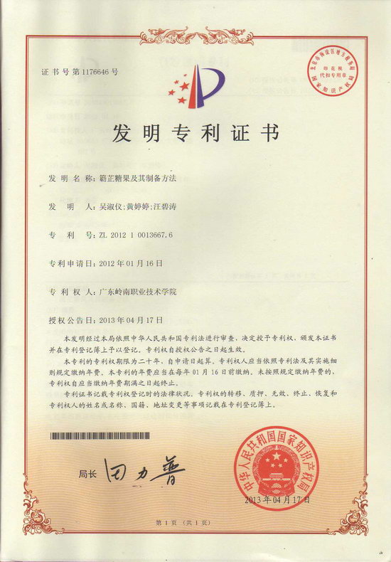 岭南新闻网 近日,岭南职院医药健康学院吴淑仪、黄婷婷同学,汪碧涛教授如愿收到了国家知识产权局颁发的发明专利证书,这也是我校学生首次发明获得国家发明专利,整个发明过程处处体现了学生自主学习,主动创新的精神。