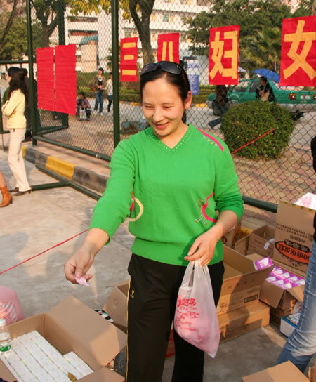 当天有巾帼英姿(飞镖),吹毛求疵(吹乒乓球),敏捷大方(跳大绳),出手大方(套圈),百发百中(立定投篮),无限飞翔(踢毽子),悠然自得(钓鱼跑),连绵不绝(排球单人垫球),铿锵玫瑰(足球射门)和捷足先登(抱球跑)等活动。每个活动都有50份礼品,参加者可通过一定的积分来换取兑奖券。