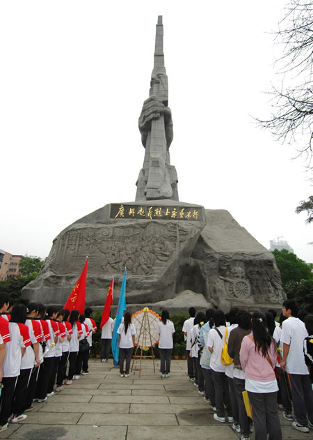 陵园大道宽阔笔直,两旁的苍松翠柏,庄严肃穆。我们列队站在广州起义烈士陵园石碑前,听解说员讲解那段沉重的历史,唤醒沉睡的爱国情怀。在烈士碑下,领头的两名同学手捧花圈,悼念烈士们的丰功伟绩。