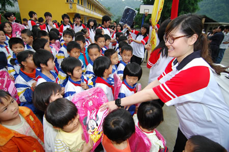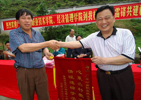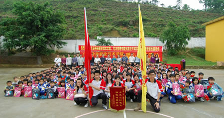 用爱点亮心中的希望[图]作者:岭南教育 发布日期:2008-4-14 11:20:00 点击数:      岭南网讯   4月11日,为资助贫困受灾地区儿童以及其家庭,学院党委书记丁纪平与经济管理学院等一行47人到粤北山区英德市连江口镇连樟村中心小学开展“用爱点亮心中的希望”爱心助学活动。