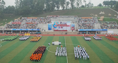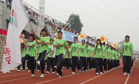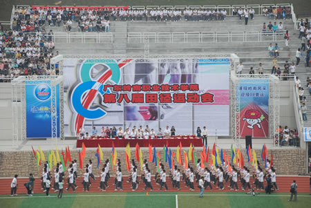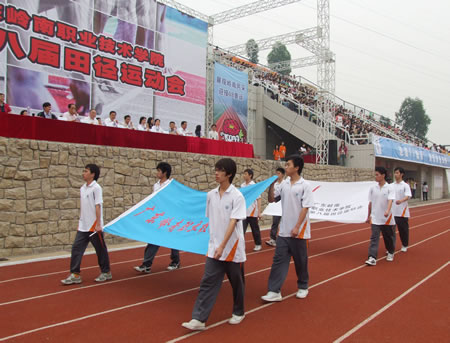 在礼炮声和欢呼声中,钟燕锋院长严宣布:“第八届田径运动会开幕!” 伴着铿锵有力的音乐声,裁判员代表队、教职工代表队、各二级学院参赛代表队踏着整齐的步伐,喊着嘹亮的口号,着装整齐地走过主席台。运动员进场完毕后举行了庄严的升国旗仪式。健美操、跆拳道、啦啦操、拔河等表演,编排新颖、场面宏大,充分展现了当代大学生喜迎奥运的蓬勃朝气。