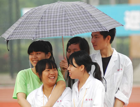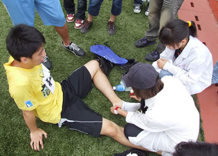 在运动场上,我们可以看到一群穿着白大褂的身影活跃在运动场的每个角落里,他们是来自药学院的医疗队。每当有运动员在比赛时不小心受伤,或者是不小心摔倒,冲刺终点后疲惫不堪的运动员们,他们总是尽心尽责,细心照顾那些运动员。绷带含着他们的细心,捂好了运动员扭伤的痛,纯净水含着他们的贴心的甘甜,洁白的纸巾含着他们的关爱……