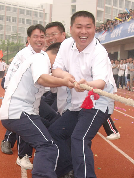 4月25日,开幕式结束后,教职工分16个小组进行拔河比赛。