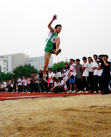 男子跳远比赛,信息工程学院的廖堪泉同学以6.08米打破了2001年由经济管理学院刘志同学创下的5.89米的校运会记录。但紧跟着经济管理系的焦焯华也毫不退让,眼看着继续挑战的运动员越来越少,这场比赛就几乎成为了廖堪泉与焦焯华的颠峰对决。最后,焦焯华以6.47米的成绩打破了廖堪泉的记录,跃为第一名。
