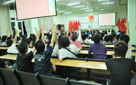 交流会首先在庄严的团歌中开始了第一流程。学院领导在致幕词中指出:要认真学习团员精神,提高共青团的综合素质,关注当前的奥运大事,争当新时期的优秀团员。引人深思,奋人激昂致幕词,使本次交流会有秩序开展着。主持人对团章概述介绍,团旗、团徽、团歌和团证认真讲解及优秀团支书、优秀团员代表经验、体会的交流,在其中还穿插了有关奥运、奥运圣火的短片和有奖抢答环节,活跃整场交流气氛。(学生记者  文/余海霞  图/杨 纯)