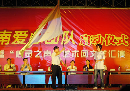 同一片蓝天下,中华儿女,血肉相连,岭南师生永远和灾区人民在一起。学院团委副书记古永平宣读了献爱心倡议书,呼吁大家踊跃向四川汶川灾民伸出援手。同时,俞仲文总裁为岭南爱心团队授予旗。大家走向爱心募捐箱前,纷纷慷慨解囊,当场总计捐款达20余万元。李玉春副院长认为,师生爱心募捐是任何金钱都买不到的最为宝贵的精神援助,也是爱心团队成立的根本目的和意义所在。我们欢迎所有志愿加入爱心团队的人们和我们走到一起,把爱心的火种永远传递,让爱的气息散落世间的每个角落,为地震灾区贡献自己的微薄之力。 贺惠山董事长希望岭南全体师生奉献爱心,用爱心点亮心灵,用爱心点亮别人。