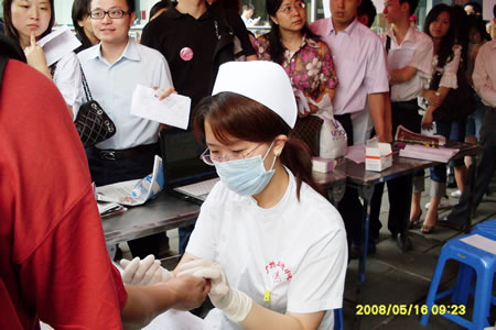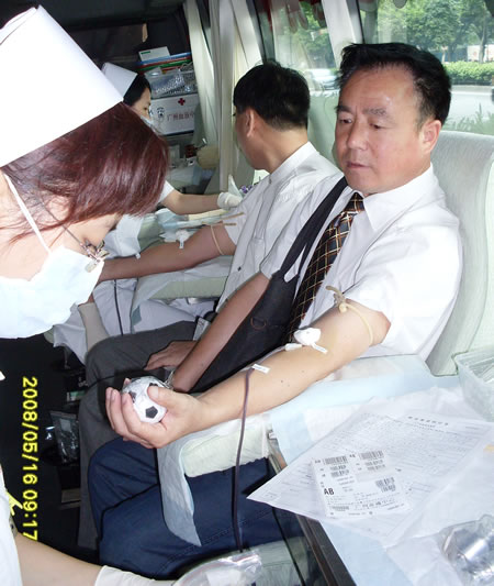 16日早晨6:00,洗漱完毕,匆匆吃了早餐,从小新塘坐公车赶到天河体育中心已是8:00,第一个站在队首的位置等候心里很高兴。我想,这次万无一失了吧。随后,人越来越多,自觉排队等候给四川汶川灾区献爱心。大约9:00流动献血车缓缓驶来,戛然而停。我第一个被验了身份证,领表,快速填写。采血人员从电脑存档记录里查验到我以往的献血资料,证实AB血型,不用再验,兴冲冲第一个上车捋起了胳膊。看着皮管里边殷红浓稠的血浆流入血袋,心中想着“血浓于水”,的确不假。