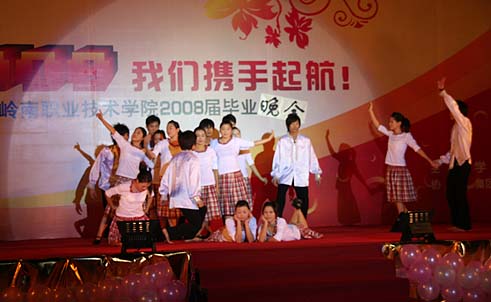 2008,让我们携手起航(图)作者:岭南教育 信息来源:不详 点击数: 更新时间:2008-7-1 2008年6月28日晚上7点半,由学院学生处主办,集团品牌管理中心协办的广东岭南职业技术学院2008届毕业晚会在学院体育馆里举行,才华横溢的岭南学子们准备了自编自导自演自唱的音乐剧、歌唱组合、魔术、舞蹈等等精彩节目。学院党委丁纪平书记、学生处傅谦处长、学院团委以及各学院院长、助理和学生们欢聚一堂,一起观看了演出。 学院党委丁纪平书记在晚会开始前感慨着,“这三年是难忘的三年,08届的岭南学生见证了岭南的发展,度过了十分有意义的三年。”他代表岭南全体师生祝贺08届毕业生即将打开人生新的一页,并希望他们秉承岭南学风,为岭南争光。