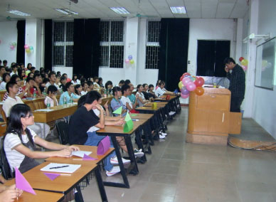 岭南网11月11日报道 为了丰富学生的课外知识,为了加强08年新生与师兄师姐的联系,于2008年10月31日 药学院举办了一场别开生面的知识竞赛,涉及的知识广,而且富有乐趣,让每一位参赛选手,每一位观众,不仅丰富了知识,还让大家在紧张的学习中得到了放松。这次活动得到了大家的热烈支持。 同学们积极地参与其中,当晚把参赛选手分成5组,蓝,红,黄,绿,紫。 我院的王达兴老师宣布“智慧之形”知识竞赛正式开始,主持人读出比赛规则,每一位参赛者都认真起来了……一题医学题,让在座的每一位瞪大了眼,也让绿组的选手十分郁闷。