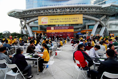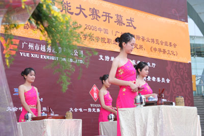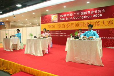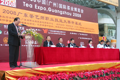 11月21日,中国(广州)国际茶业博览会暨广东茶艺师职业技能大赛开幕式在广州·琶洲·中洲中心举行,广东省茶业行业协会会长穆有为、广东省职业技能鉴定指导中心主任陈锐彬、广东省茶业行业协会秘书长张黎明、广州市越秀展览有限公司总经理李广韬,华南农业大学园艺学院党委副书记丁红星,广东科贸职业学院教授、2008广东茶艺师职业技能大赛裁判组长伍锡岳,广东岭南职业技术学院院长钟燕峰。以及广东省珠海市第一中等职业学校领导,广东省劳动和社会保障厅职业技能鉴定指导中心嘉宾,《中华茶文化》期刊主编以及大赛评委委员王汉生教授、戴素贤教授、李婷、王丽、苏巧雯、凌彩金,以及广大茶叶从业人员,茶艺、茶文化爱好者和各大新闻媒体记者。中国茶叶流通协会副会长、广东省茶业行业协会会长、广东省茶叶学会理事长穆有为,广东省劳动和社会保障厅职业技能鉴定指导中心主任陈锐彬,广州市越秀展览有限公司总经理李广韬为大赛揭幕。