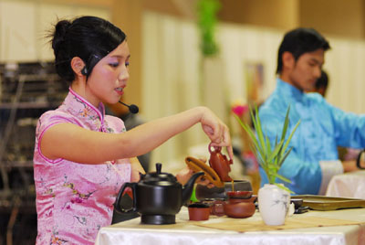 本届特色: 全球茶商借东风 11月21日开幕的广州茶博会,展览面积达到4万平方米,共设展位1000个。作为世界产茶大国,国内茶企仍是参展主力军。今年,国外、港台地区参展单位热情高涨,组成了阵容强大的国际展团。来自港台地区和印度、斯里兰卡、美国、越南、肯尼亚、马来西亚等茶叶产销国家纷纷带上各地名茶亲临中洲展馆。中国、印度、斯里兰卡、肯尼亚、越南等亚非主要茶叶产销大国的代表聚首中洲中心,参加国际茶业交流会,各国借助广州茶博会的平台效应,就目前国际茶业的发展状况和各国关心的茶业问题进行探讨,共同促进行业发展。