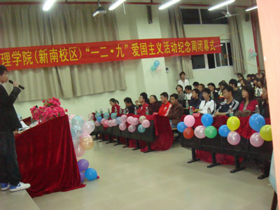 2008年12月12日晚7点30分,经济管理学院新南校区在4101教室举行了 “一二·九爱国主义活动纪念周”闭幕式。经管学院院长助理杨燕雄老师、朱海平老师和新南校区全体辅导员以及各班级300多名代表出席了现场。在闭幕式中我们回首了中国不平凡的2008,回顾了今年“一二·九爱国主义活动纪念周”各项活动,举行了爱国知识问答,表演了精彩的爱国主要节目等等。