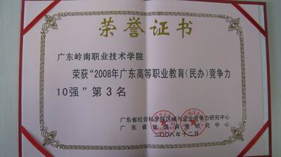 其中“2008年度广东高等职业教育院校(民办)竞争力评估排名”前十强中,我院名列第三名。《南方日报》、《广州日报》、《羊城晚报》等主流媒体以较大篇幅报道了我院一年来的累累硕果。首次进入前三的、“华南新秀”东莞南博职业技术学院与我院并列第三。专家表示,这说明广东省民办高等职业院校的整体发展速度越来越快,第二梯队的民办院校逐渐有追赶第一梯队的趋势。