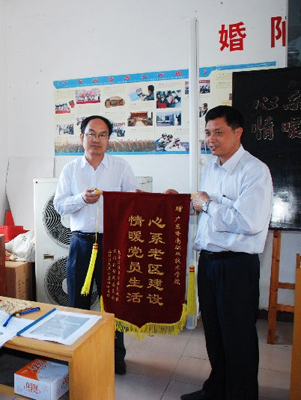 罗腾委员接过锦旗 岭南网讯 商学院第一党支部于4月25日,组织50名师生党员和入党积极分子来到韶关市乳源瑶族自治县云门革命老区,开展“心系老区建设,情暖党员生活”的最佳党日活动。 广东岭南职业技术学院党委委员罗腾、学院党委干事杜海南,商学院第一党支部书记杨燕雄、副书记陈水斌、青年委员陈松燔,商学院物流管理专业教研室主任萧斌以及商学院40名学生党员和入党积极分子参加了此次活动。 此次活动得到当地领导干部的极大重视,乳源瑶族自治县民政局张祝英副局长、云门村所属乳城镇党委副书记、云门村委支部书记、干部以及云门村老党员代表都给予了热情的接待和大力支持,乳源瑶族自治县电视台也专门委派记者到活动现场进行采访跟踪报道。 活动内容秉持充分贯彻落实深入学习实践科学发展观这一主轴,紧扣“心系老区建设 情暖党员生活”这一主题,积极开展了老党员先进事迹报告会,深入学习实践科学发展观与新农村建设研讨会,一对一扶贫工作座谈会等会议,并深入到15位老党员家中进行参访慰问、分发慰问品并帮助解决相关困难;相关活动内容取得诸多学习成果和良好社会反响。