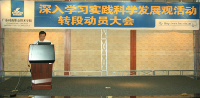 王新新同志讲话 岭南网讯 4月28日,深入学习实践科学发展观学习调研阶段工作小结暨分析检查阶段转段动员大会在我院隆重召开。广州岭南教育集团董事会代表、广东岭南职业技术学院院长钟燕锋,广东岭南职业技术学院党委书记丁纪平及全院中层以上干部、各支部党员、入党积极分子等400余人参加会议,会议由学院党委副书记程翠英主持。省委深入学习实践活动第十三指导检查组组员、广东轻工职业技术学院党委副书记、纪委副书记王新新列席了本次大会。 首先丁书记作了以《学习与实践不脱节、促进学院教育事业科学发展》为主题的转段动员报告。报告中,丁书记从活动的组织发动、深入调查研究、突出办学特色几个方面对我院开展学习实践活动学习调研阶段进行了总结。他提出“经过认真调研查找,听取广大师生意见和建议,初步明确了我院目前存在的问题。”并且强调“科学发展观是促进学院发展的有力保障,必须保持学习与实践相结合”。对分析检查阶段的工作,丁书记做了进一步的部署,提出“分析检查阶段是学习实践活动承上启下、从思想层面进入实践层面的重要阶段,是巩固和扩大学习调研阶段成果,确保学习实践活动取得实效的关键。做好分析检查工作,对于巩固和扩大学习调研阶段的的成果,奠定和打牢整改落实阶段的基础,保证整个学习实践活动真正取得实效意义重大。”接下来丁书记对我院开展分析检查阶段的具体任务和要求做了安排。 随后,王新新同志代表第十三指导检查组作了讲话。王新新对我院开展实践活动学习调研阶段的成果表示肯定。他说道“广东岭南职业技术学院依据‘党员干部受教育,科学发展上水平,人民群众的实惠’的总体要求,联系学院实际情况,推动全员学习实践活动,开展顺利,亮点较多,成效显著。”对于分析检查阶段的工作,王书记对我院进行了鼓舞,他提出了五点希望:“一是坚持思想,发动先行,保持先进性与主动性;二是高标准、严要求,确保这次深入学习实践活动工作圆满结束;三是重实际,讲效果,突出实践特色;四是加大宣传力度,营造更浓厚学习氛围;五是着力增强分析检查阶段的实效性、目的性。”王书记还说道民办高校要处理好“办实业”与“办教育”的关系,把主要矛盾放在“办教育”上,他相信,我院继续深入学习实践科学发展观,定能为我院发展、创新带来实效,我院定能成为民办高校科学发展排头兵。   最后,程副书记总结发言,整个会议过程掌声不断,掀起了我院开展实践活动的又一个热潮。  |