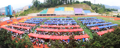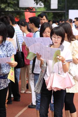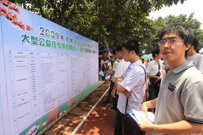 岭南网讯 5月26日十时许,广州开发区管委会、广州市萝岗区人民政府主办,广州开发区、萝岗区劳动和社会保障局,广东岭南职业技术学院协办的“2009年大学毕业生及技能人才大型公益性专场招聘会”在岭南职院举行。 设在岭南职院体育场的招聘会场,求职者排队等待入场,来自广东的200多家用人单位携2000多个工作岗位来抢优秀人才,吸引了数千名广东高校的大学生前来应聘。仓库管理员、文员、报关员、检验员等岗位成大学生拼抢的热职。岭南职院现代制造、信息工程、医药健康、外语外贸等类毕业生备受企业青睐,数百人达成求职意向。而且,岭南职院大一、大二的许多学生也来到招聘会“试水”,提前做好择业准备。(图/浩洋)