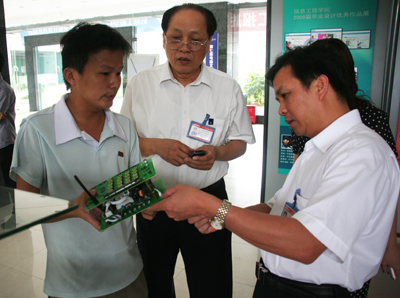 信息工程学院的优秀作品展分“2009年电脑文化艺术节”和09毕业设计优秀作品展两个部分,该学院今年有8个专业的毕业生,总数有700多人,此次参展包含所有专业毕业生代表,参展人数占毕业生总数的10%.参观中钟院长还饶有兴致地和该学院孙兵老师就学生毕业设计的产品转化以及市场推介等内容进行了交流。