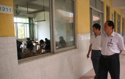 岭南网讯  6月30 日上午,岭南职院08-09第二学期期末考试正式开考,岭南职院领导带领教务处、学生处、各二级学院院长、学务助理亲临第一教学楼、第三教学楼巡视考试情况。本学期期末考试实际有8316人次参加考试,共计595场,动用课室116间。开考当日考试秩序井然,学生考风有了明显改善。