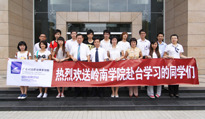 岭南网讯 广东岭南职业技术学院第二批赴台交换生,于14日踏上赴台旅程,集团总裁钟燕锋、学院院长俞仲文等领导,在学院图书馆前为交换生举行了简短的送行仪式。来自移动通信、玩具设计、艺术设计等5个专业的9名学生,将分别在台湾朝阳科技大学及建国科技大学进行一个学期的学习、生活。