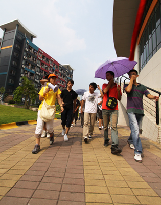 岭南网讯 师姐当“导游”带师弟师妹游校园,挺新鲜。9月16日,商学院08涉外旅游班校内导游模拟实训启动,“导游”们等待各专业09新生的到来,开始本次校园之旅。虽然天公不作美,但各个“导游”激情的讲解以及新生们的好奇心一点都没有减少,而“导游们”也尽力的为新生们解答。