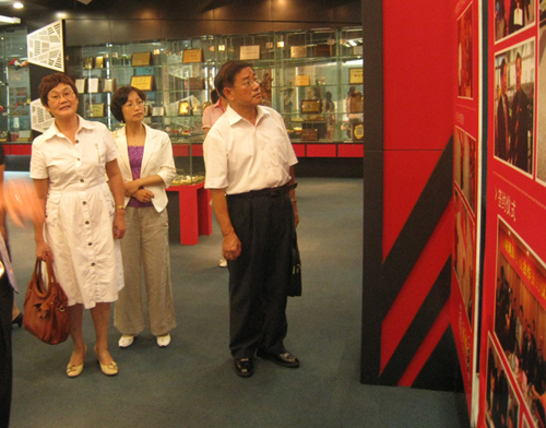 广州科技职业技术学院院长胡日章(右)参观校史馆