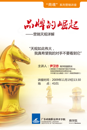 岭南新闻网 11月19日,商学院主办的“商魂”系列营销讲座将在4101教室启动,首场开讲嘉宾是美国CDM集团原南中国区市场总监、岭南职院商学院副院长尹卫忠。 “商魂”系列营销讲座将持续至期末,活跃于商学院及岭南后现代风情街的大学生创业先锋,希望用营销的策略拓展自己的思维方式和应对创业的危机,发掘自身的创造力。 尹卫忠表示,“商魂”系列营销讲座酝酿已久,活动只希望让更多岭南学子了解“营销”的魔力,感受营销的非凡创意。我讲《品牌的崛起——营销天规详解》,有一个非常简单的使命,那就是让更多的一线营销人不要走我走过的弯路。 海报贴出,在岭南职院学生中反响热烈,学生的好奇心被“商魂”唤醒来。 有师生表示,听这个讲座可能遇到“魔”,见识尹卫忠的“商魂”精神。 更有学生连现场提问的问题都写好了。尹卫忠笑谈,“商魂”绝对是一场不容错过的“创意”体验。 (《岭南教育》记者 谢谢) |