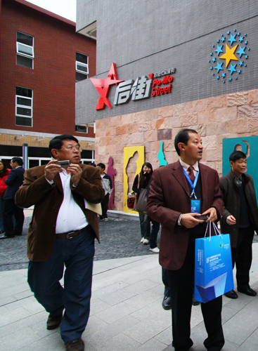 岭南新闻网 2009’中国国家级开发区职业教育年会,在11月18日广州科学城隆重开幕。下午,出席年会的开发区、职业院校代表100多人,来到广东岭南职业技术学院参观,代表们走进广东大学生就业创业基地“后街”时,被眼前的建筑和商铺迷得停住了脚步,纷纷驻足观看,边听取介绍员介绍,边掏出相机拍照留念。