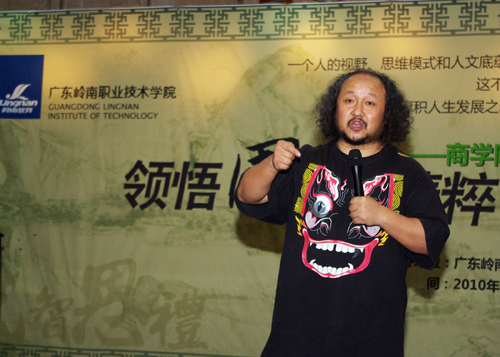 岭南新闻网 24日下午,广东岭南职业技术学院商学院把“策划魔兽”邀请到学院。中国十大策划人张晓岚给商学院学子带来一场“领悟国学精粹,成就商战智慧”的讲座,这是商学院商魂系列讲座之“国学与现代商战”的第一场讲座。 商魂系列讲座同普通讲座不同,讲座开场后一直不断的是笑声和掌声。这场讲座是张晓岚本月在广州第5场讲座。这一次张晓岚身着“鬼面”黑衣,笑侃中国式营销。