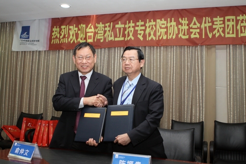 俞仲文校长表示,岭南职院的台湾交流生对在台湾学习反响很好,希望两岸高校学习交流形式能更加多元化,除派交流生学习形式外,也可以在暑假开展夏令营活动,共同促进两岸学生的学习交流。 双方人员就夏令营的组团人数、活动时间、内容、费用等进行了详细讨论。陈振贵理事长对夏令营的提议十分赞同,他表示争取在暑假前把两岸大学生的夏令营活动落实。 推进双方的师资交流培训 “我们很希望台湾的老师能给我们的教师作培训,目的为了提升教学水平,一方面可以对专业的核心课程进行交流培训,另一方面可以对教学计划、管理进行探讨培训。”俞仲文校长说。 经过深入洽谈,双方初步达成可以做以工科为主的新技术、新能源方面的培训,具体的合作培训项目、方案将会进一步推进。 随后,岭东科技大学校长陈振贵与岭南职院校长俞仲文共同签订了《岭东科技大学与广东岭南职业技术学院学术合作协议书》,双方表示会更好的促进彼此的文化交流与友谊,继续加强两岸高校的合作交流。