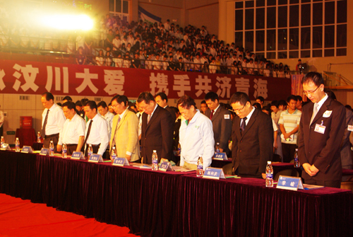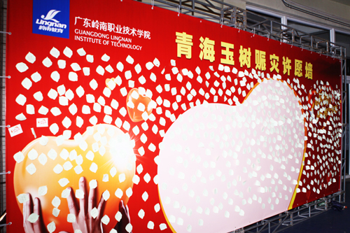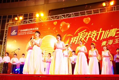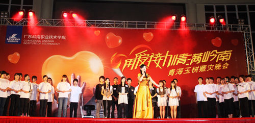 玉树地震赈灾晚会昨晚举行作者:佚名 信息来源:本站原创 点击数: 更新时间:2010-4-30 晚会入场处的许愿墙,贴满了祈福条 三千多名师生聚在岭南职院体育馆为玉树同胞祈福 广州岭南教育集团、岭南职院、现代技工学校等单位领导为玉树遇难者默哀 宣读各单位的捐款数 岭南职院艺术团表演《那些孩子》 岭南学子表演节目 岭南师生表演节目 现场募捐 集团财务总监周惠莲(右二)、岭南职院校长俞仲文(左三)、副校长李峻(右一)、校长助理程翠英(右四)、岭南继续教育与培训学院副院长刘国章(左一)、现代技工学校常务副校长童国梁(右三)、数字教育学院校长刘弈君等七位领导深情朗诵《相信》 著名教育家、岭南职院校长俞仲文走上舞台与全体演员合影 岭南职院党委书记丁纪平
