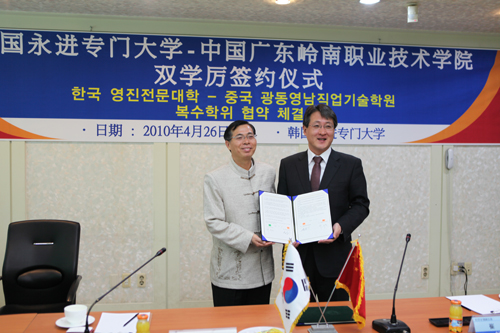 集团高层出访韩国 考察职业教育发展作者:佚名 信息来源:本站原创 点击数: 更新时间:2010-5-6 广州岭南教育集团董事长贺惠山(左)与韩国永进专门大学副总长崔宰荣(右) 参观韩国永进专门大学高速精密模具中心 参观韩国永进专门大学3D模拟中心 双方在韩国永进专门大学主楼前合影