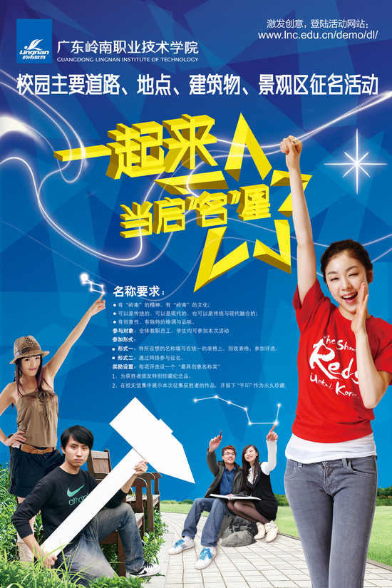 让“启名星”点缀岭南校园主要道路、地点、建筑物、景观区征名活动正式启动作者:黄雪瑶 信息来源:本站原创 点击数: 更新时间:2011-4-11 岭南新闻网 有价值、有意义的名称,是校园文化的基本载体,也是校园文化的一种表达。记者日前从学院了解到,“校园主要道路、地点、建筑物、景观区征名活动”现已正式启动,本次活动面向岭南学院全体师生,活动时间从4月中旬开始至6月份结束,分初评、网上评议、终审、颁奖、揭幕和制作施工六个阶段进行。