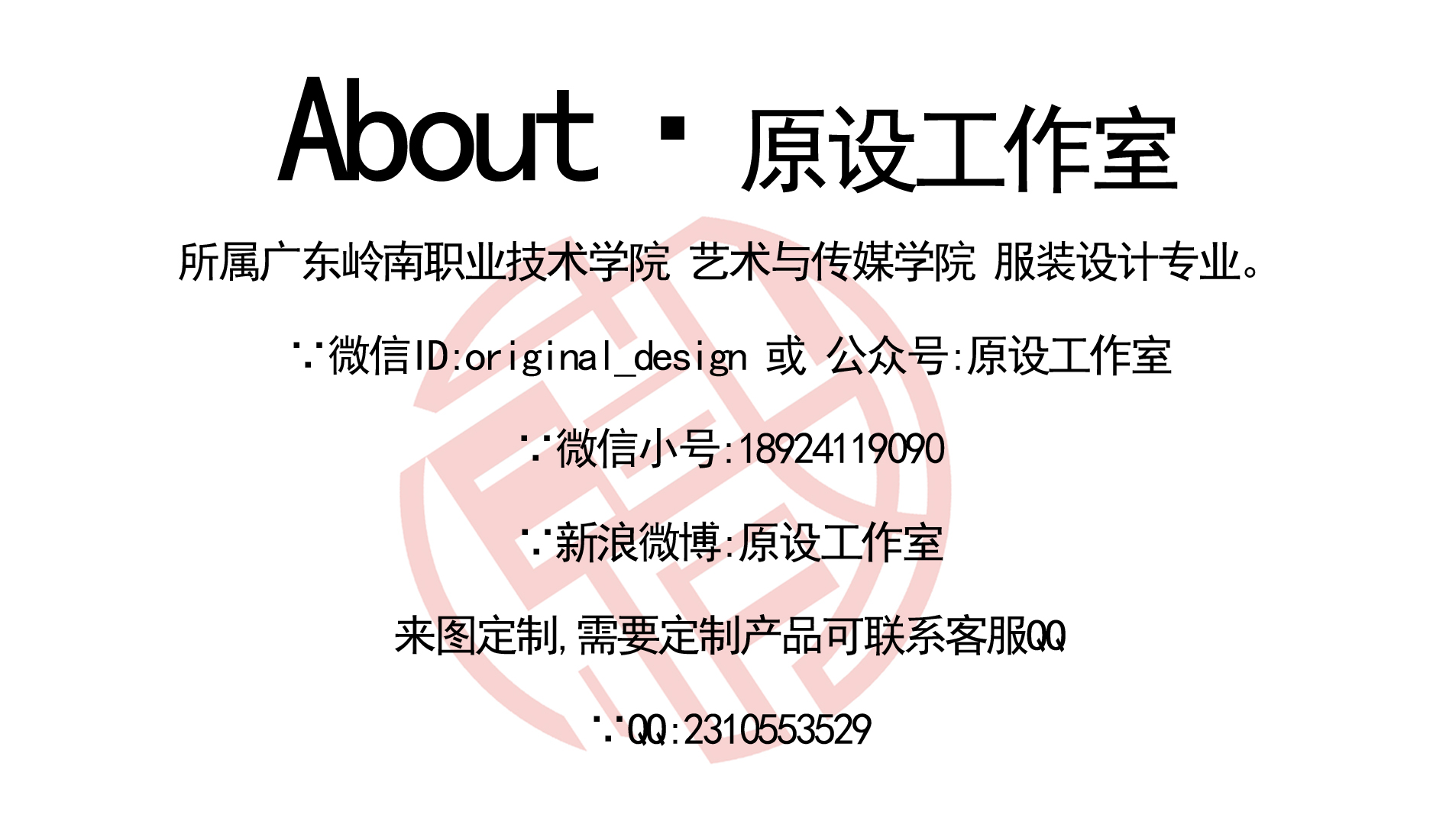 原设工作室所属广东岭南职业技术学院艺术与传媒学院服装设计专业。工作室设有设计部、业务部、印刷部、后期工艺制作等部门,主要承接图案DIY个性化定制服务。原设工作室可根据不同的客户与市场需求,配合不同的设备与生产技术,为客户提供高效快捷的数码印花加工服务以及多元化的印花产品开发和销售方案。集设计、生产、加工、营销于一体,以多种经营特色和一流服务,为国内外客户提供优质服务。 为客户提供多元化的产品开发方案以及高效快捷的图案加工服务,以多种经营特色和一流服务,为校内外客户提供优质的产品和精良的服务。