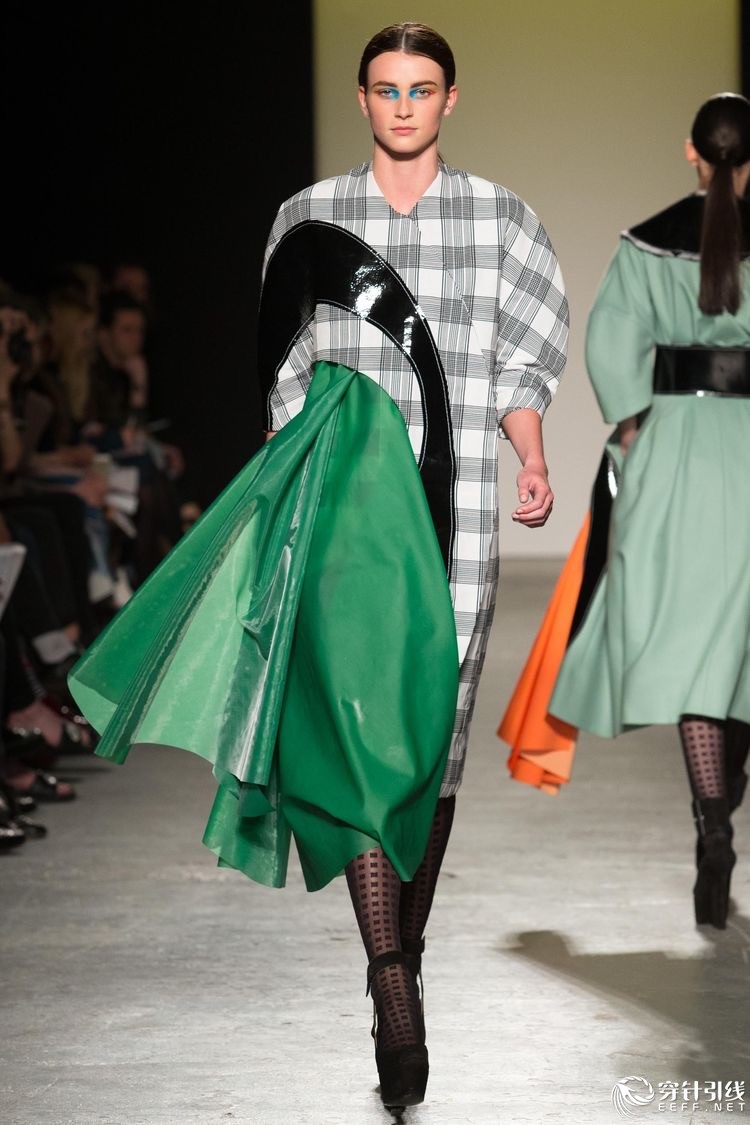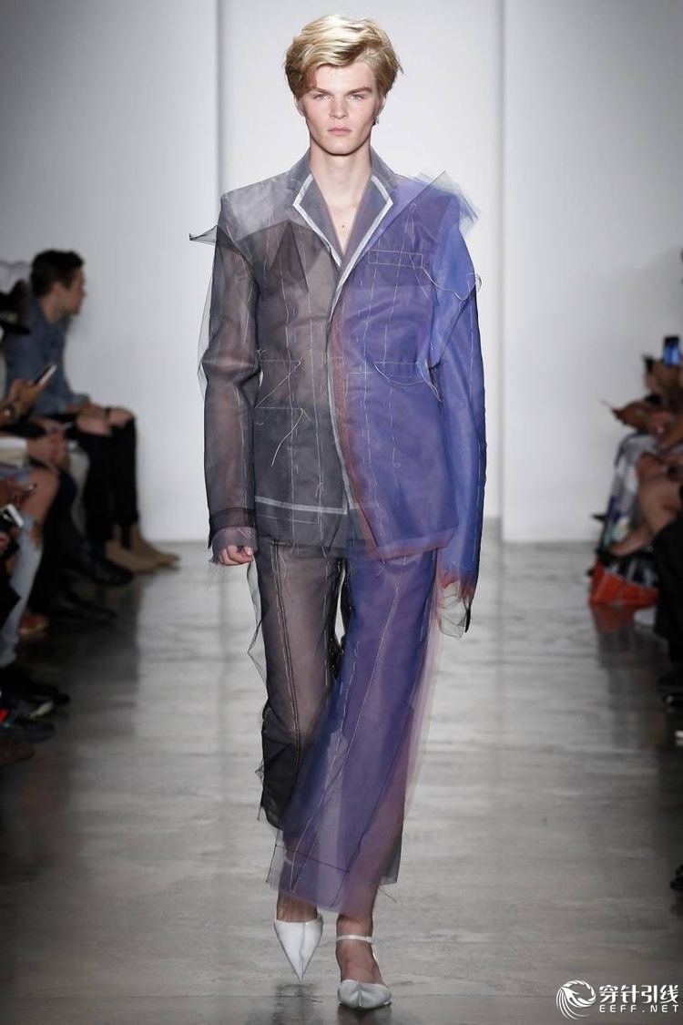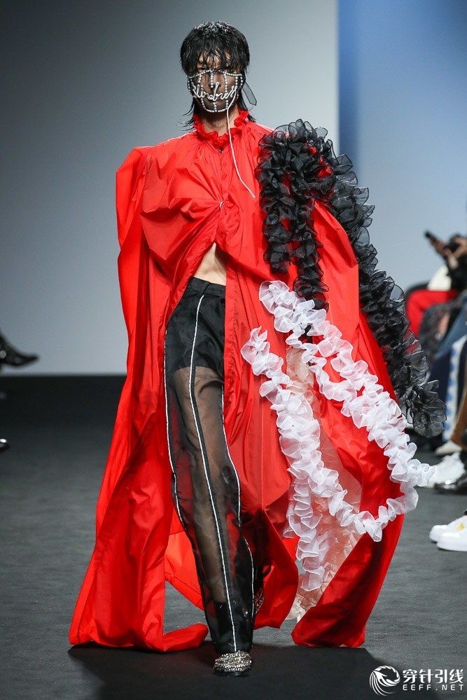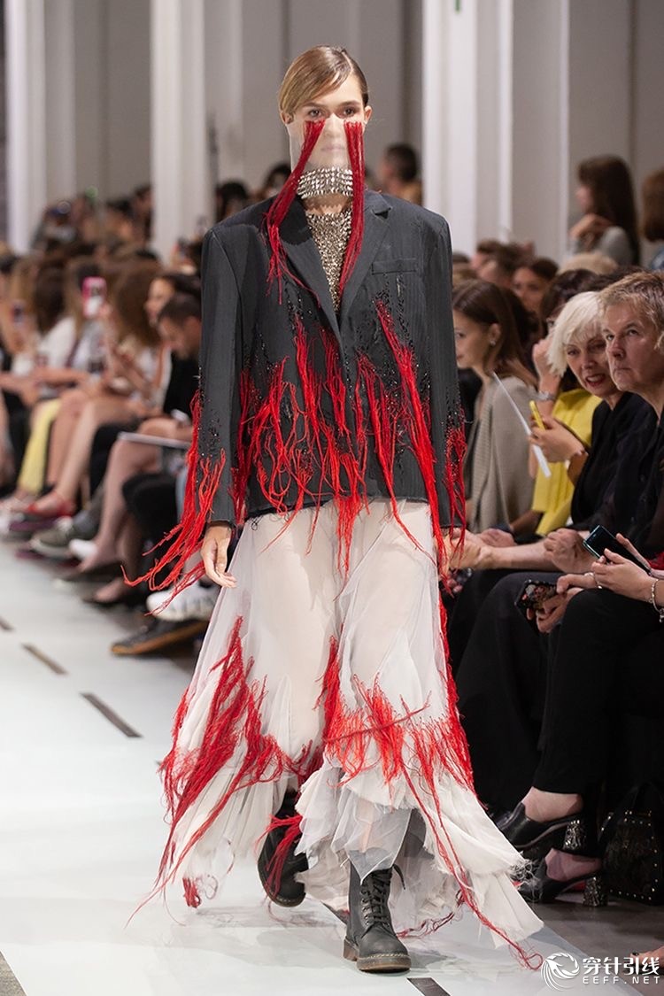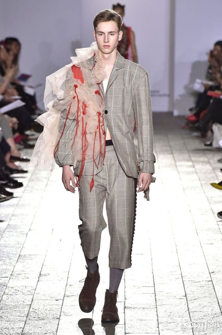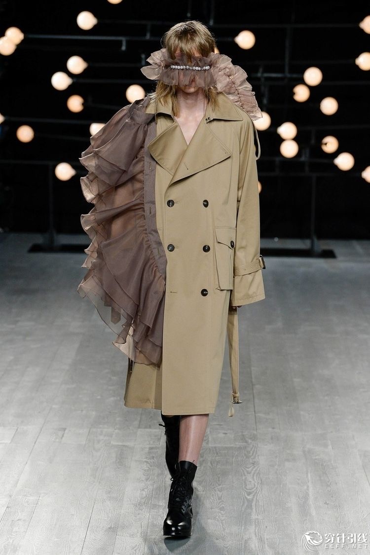 硬朗西装面料与薄纱面料的相互交织应用,薄纱做的荷叶边设计融入到服装的结构之中产生不一样的设计视觉。