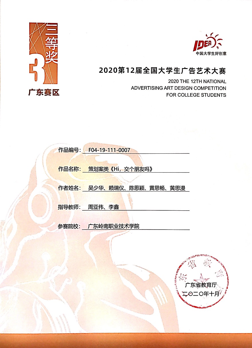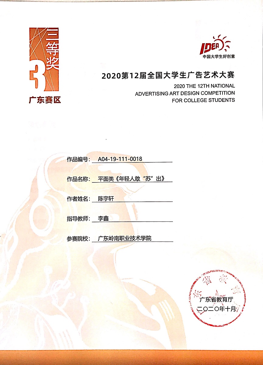 在第12届大广赛赛事中,传播与策划专业,李鑫、邹红等老师取得突出成绩。其中策划案《Hi,交个朋友吗》获国赛优秀奖,省赛三等奖。其中平面类《年轻人敢“苏”出》获省赛三等奖。