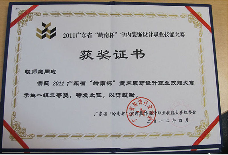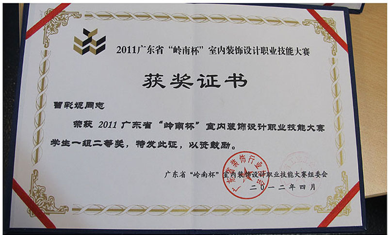 在广东省总工会、广东省人力资源和社会保障厅的大力关心下、在广东省职业技能鉴定指导中心的以及我校对艺术与传媒学院的强有力支持下,日前,由广东省装饰行业协会、广东省工业工会联合举办的2011广东省“岭南杯”室内装饰设计职业技能大赛圆满结束,据悉,本次大赛共有400名选手入围决赛,比赛伊始,我校学子积极踊跃报名,一路过关斩将,获得学生一组二等奖者两名、三等奖者一名,另外我校获得本次大赛组织奖一名,再创新的佳绩。 |