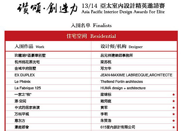 由IFI国际室内建筑师设计师团体联盟成员机构 - APDC亚太设计中心主办的APDC AWARDS “可持续前瞻设计 -2012/2013亚太室内设计精英邀请赛”于2014年7月举行。来自加拿大、法国、意大利、芬兰、韩国、马来西亚、新加坡、中国大陆、香港、澳门等国家和地区的海内外嘉宾、中外设计界权威及获奖设计师共同见证亚太室内设计行业的年度盛会。 我院装饰艺术设计专业吴世林、吴志媚、林旻仪同学的办公空间设计作品“素净之美”获得入围奖,这对于大二学生来说实属不易,我专业毕业生赖师庭同学的设计作品获得专业组铜奖。希望专业学子积极进取,再创佳绩。