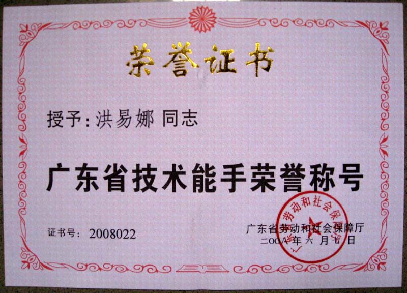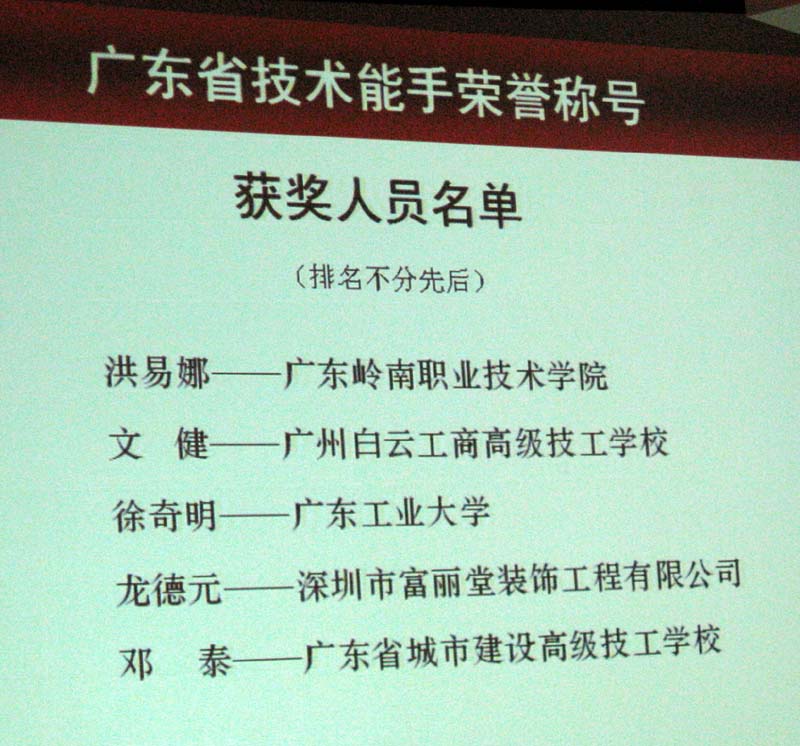 职业技能大赛职工组: ■一等奖:洪易娜(艺术设计教研室教师)获广东省劳动和社会保障厅“广东省技术能手”荣誉称号 | |||