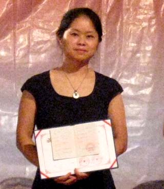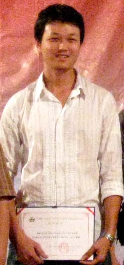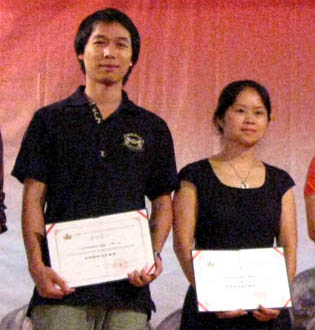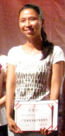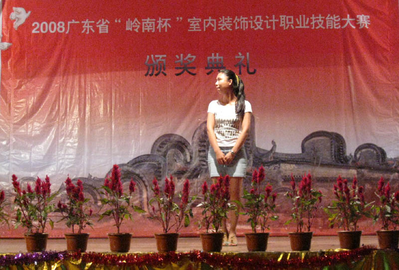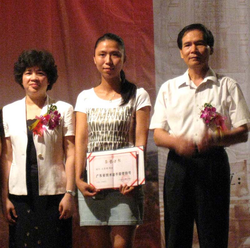 艺术设计教研室教师洪易娜在领奖台上接受广东省劳动与社会保障厅孙研究员和广东省职业技能鉴定指导中心周主任颁发的“广东省技术能手”荣誉称号证书 | |||